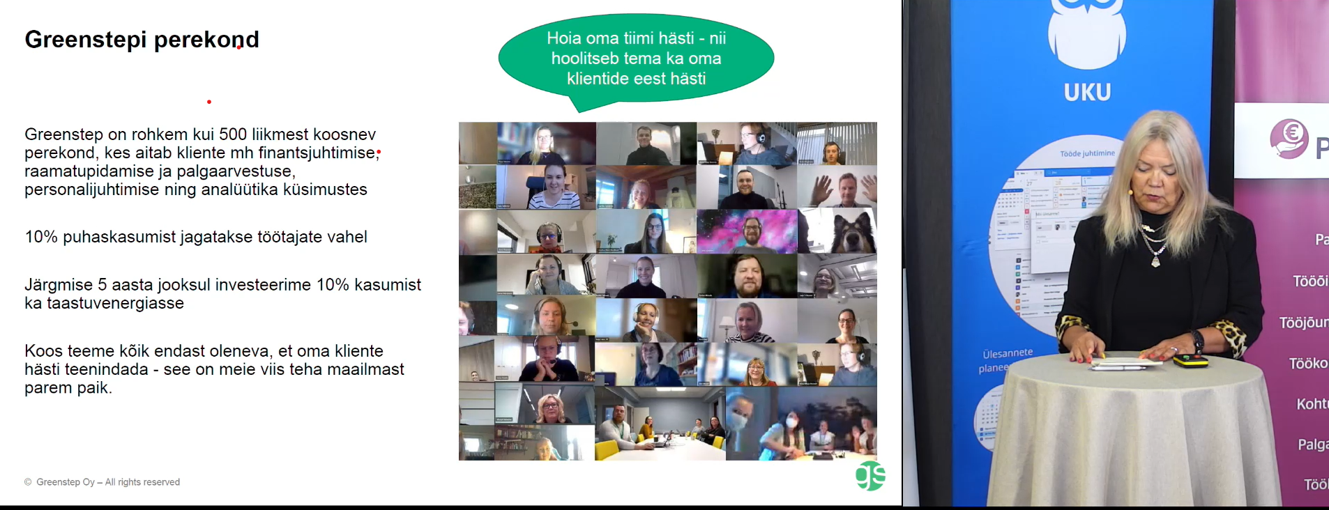 Äripäeva ja raamatupidaja.ee korraldatud konverents “Kasumlik kasv 2022” sisaldas lisaks autasustamisele huvitavaid ettekandeid ja esinemisi. Oma eduloo sai rääkida ka Greenstep. Esindaja Hanna Mursula rääkis kogu Greenstepi ajaloost, erinevatest kontoritest ning väärtustest. Lisaks keskendus ta erinevate teenuste tutvustamisele ning põhimõtetele, mida oma töös rakendame. Näiteks jagame 10% puhaskasumist töötajate vahel laiali ning kavatseme järgmise 5 aasta jooksul investeerida 10% kasumist ka taastuvenergiasse.